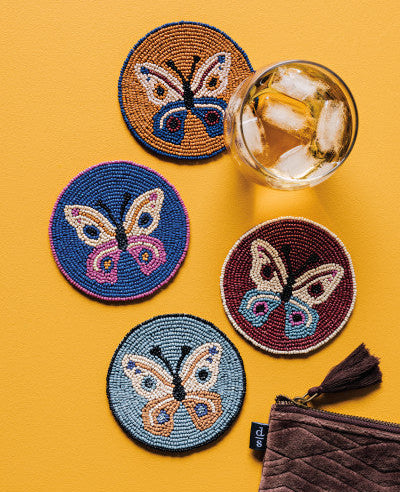 Danica Studio designs radiate from the surface of our hand-beaded coaster sets. Crafted with dyed glass beads and a strong fabric core, these little beauties are made to last.
