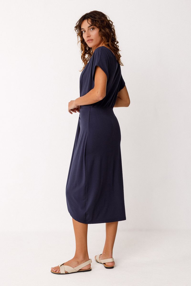 The Amade Dress proves that comfort and sophistication aren't mutually exclusive. This knee-length staple features a graceful boat neckline and dropped shoulders for a relaxed yet polished drape. The standout knotted effect at the front creates a focal point that effortlessly defines the waist, while the hidden elastic back ensures the fit is as comfortable as it is flattering.