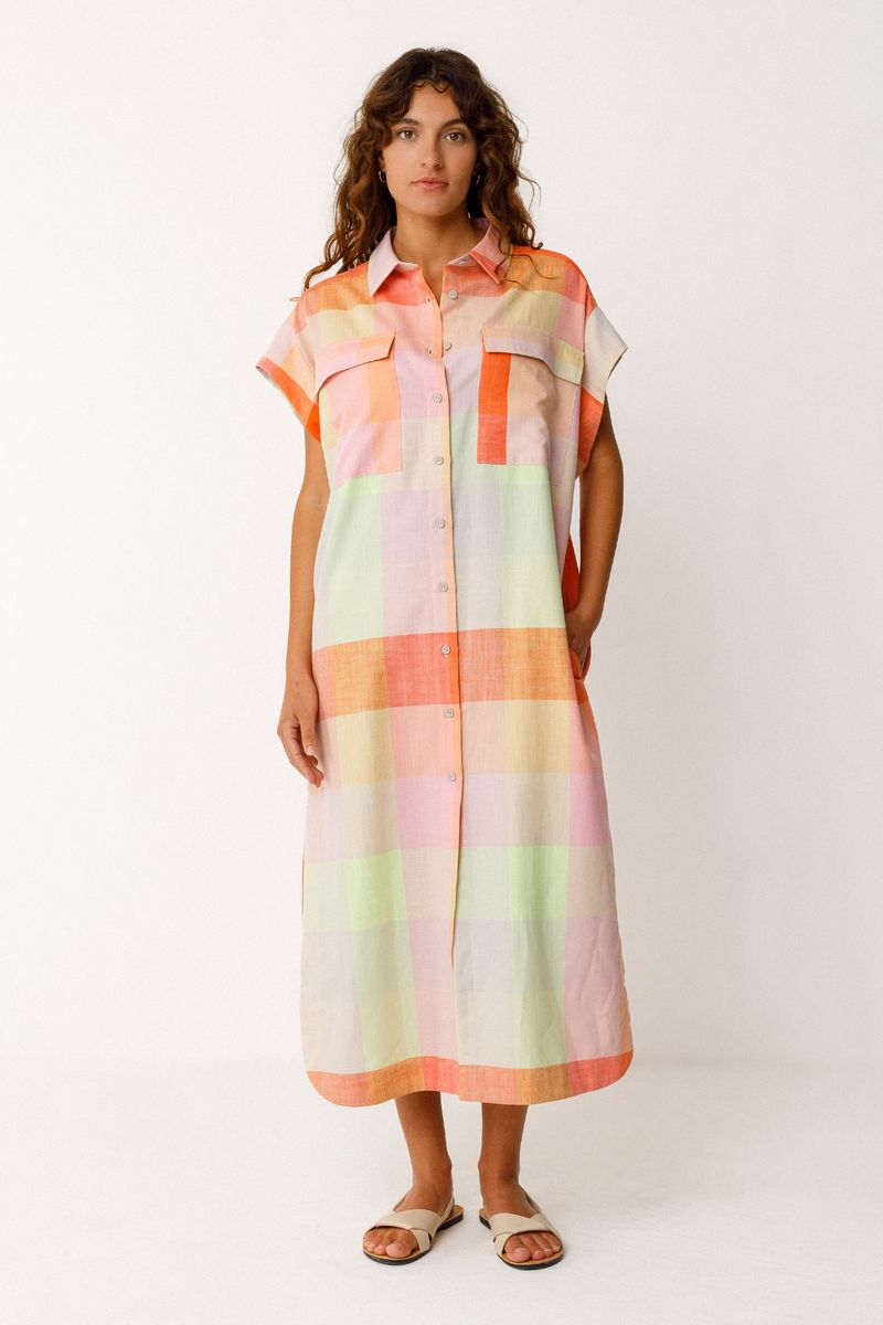 Meet the Lama Shirt Dress, a bold and breezy silhouette that captures the warmth of a summer sunset. Featuring a large-scale, multicolored plaid in shades of coral, mint, and soft butter, this dress is crafted from 100% organic cotton for a crisp yet soft feel that keeps you cool as the humidity rises.