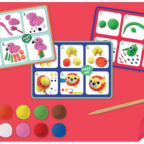 Each set comes with 6 pots of 10 different air dry clay colours, 5 double-sided instruction cards (taking you step-by-step through the creative process), a brightly coloured silicone mat and a handy wooden stylus tool for crafting.
