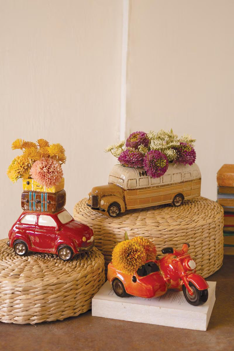 Vroom Vroom! Take your plants for a ride with this ceramic motorcycle with a sidecar planter. Gift one to the motorcycle enthusiast in your life, or save it for your knick-knack shelf.