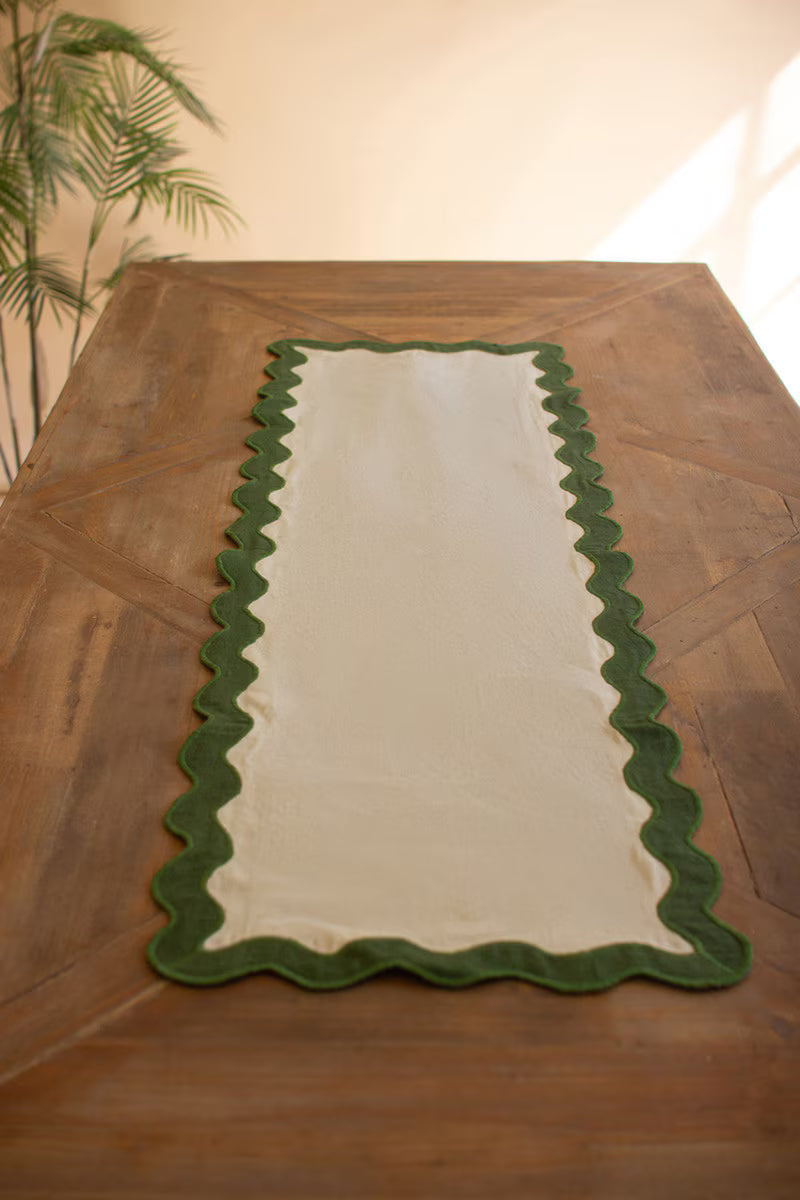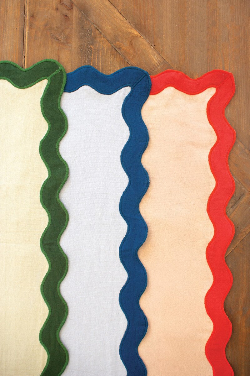 Bring playful sophistication to your table with this Wavy Edge Linen Table Runner. Designed with a crisp rectangular shape and finished with a bold, scalloped trim, it adds a fresh pop of color and texture to any tablescape.