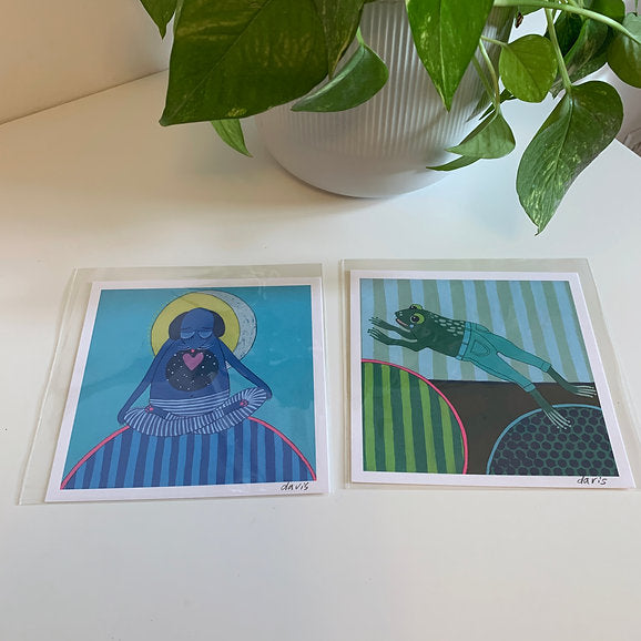 Bring a pop of color and playful charm to your walls with these mini art prints by Jennifer Davis, known for her bold palettes, expressive characters, and joyful storytelling.