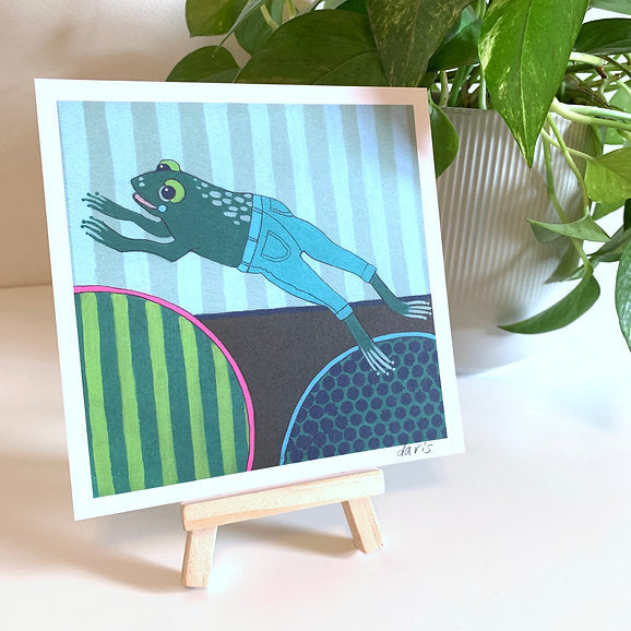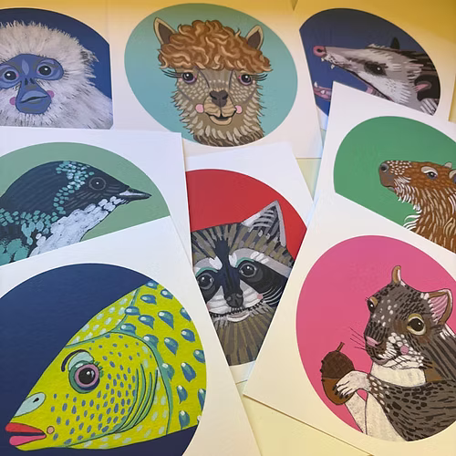 Colorful mini art prints by Jennifer Davis featuring whimsical animals like cats, fish, frogs, and sloths. Perfect for gifts, galleries, and small spaces.