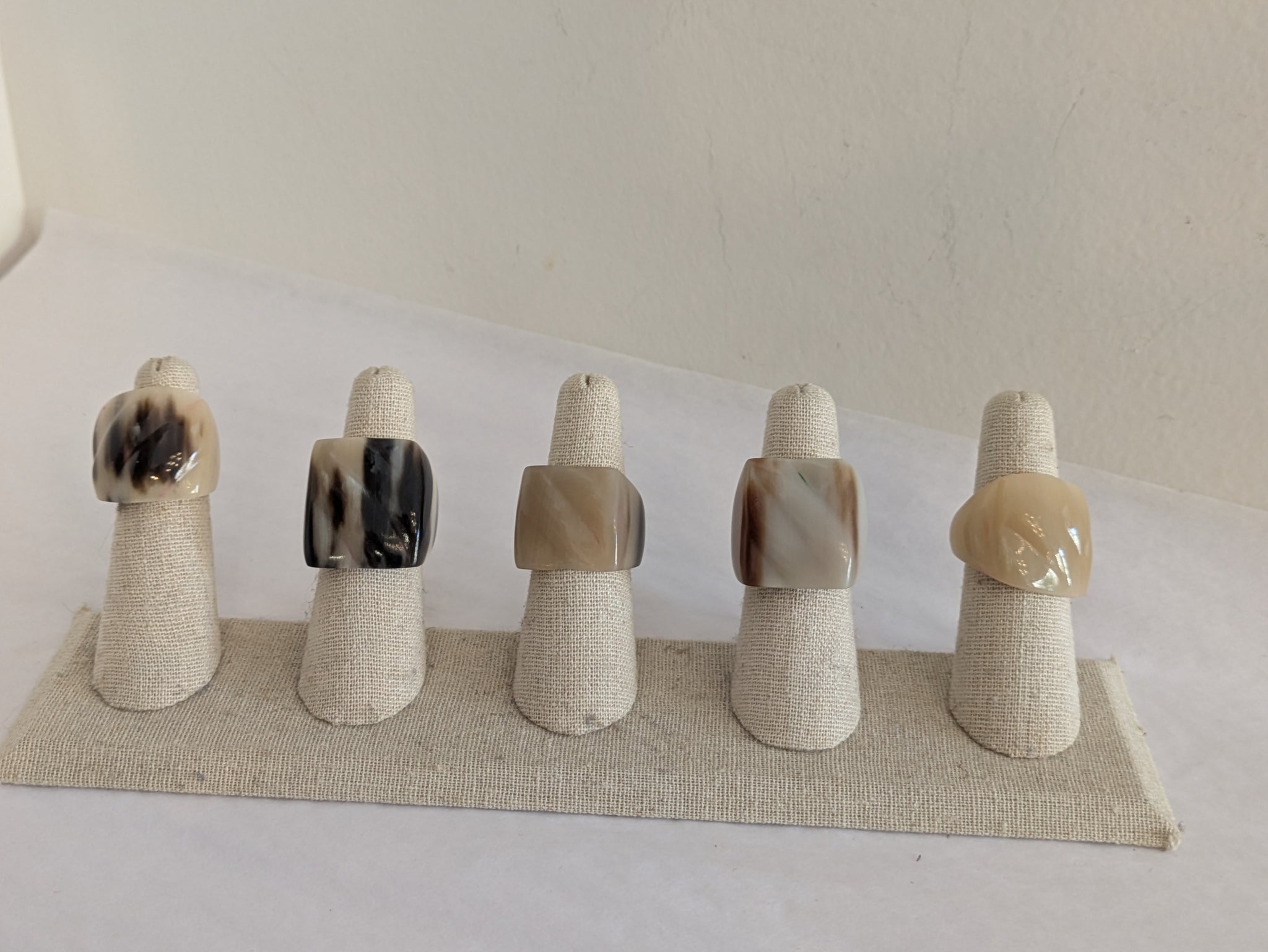 Our rings highlight the unique patterns and colors found in natural horn, making every piece truly one-of-a-kind. By reclaiming horn that would otherwise go to waste, this jewelry offers an environmentally conscious alternative to synthetic or mined materials while honoring traditional artistry.