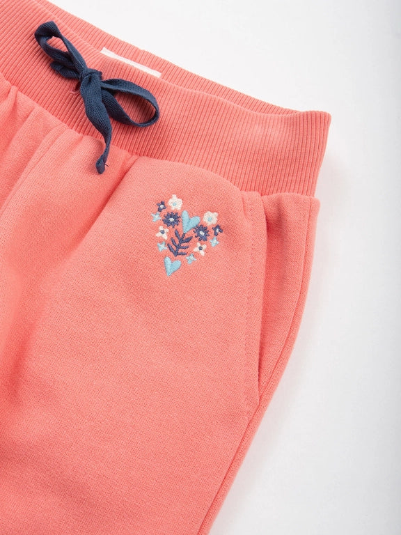 et ready for an action-packed day! Our gorgeous salmon pink joggers are an absolute essential for little ones who love to be comfy when adventuring. They feature an elasticated waistband, adjustable ties, and side pockets with a lovely heart shaped flower embroidery. Combining style and practicality perfectly, they are a wonderful option that goes with so many of our tops. Made from 100% organic cotton.