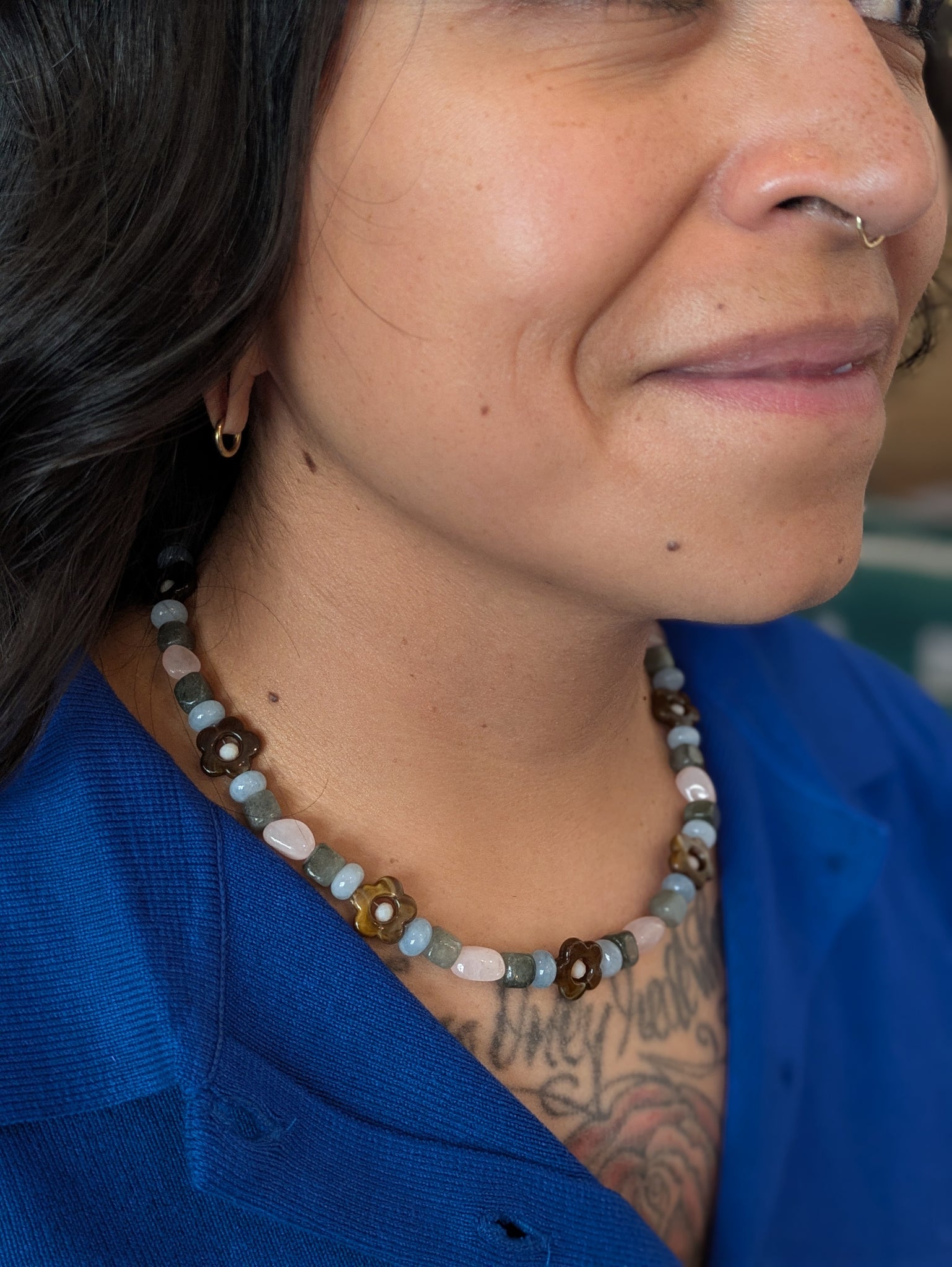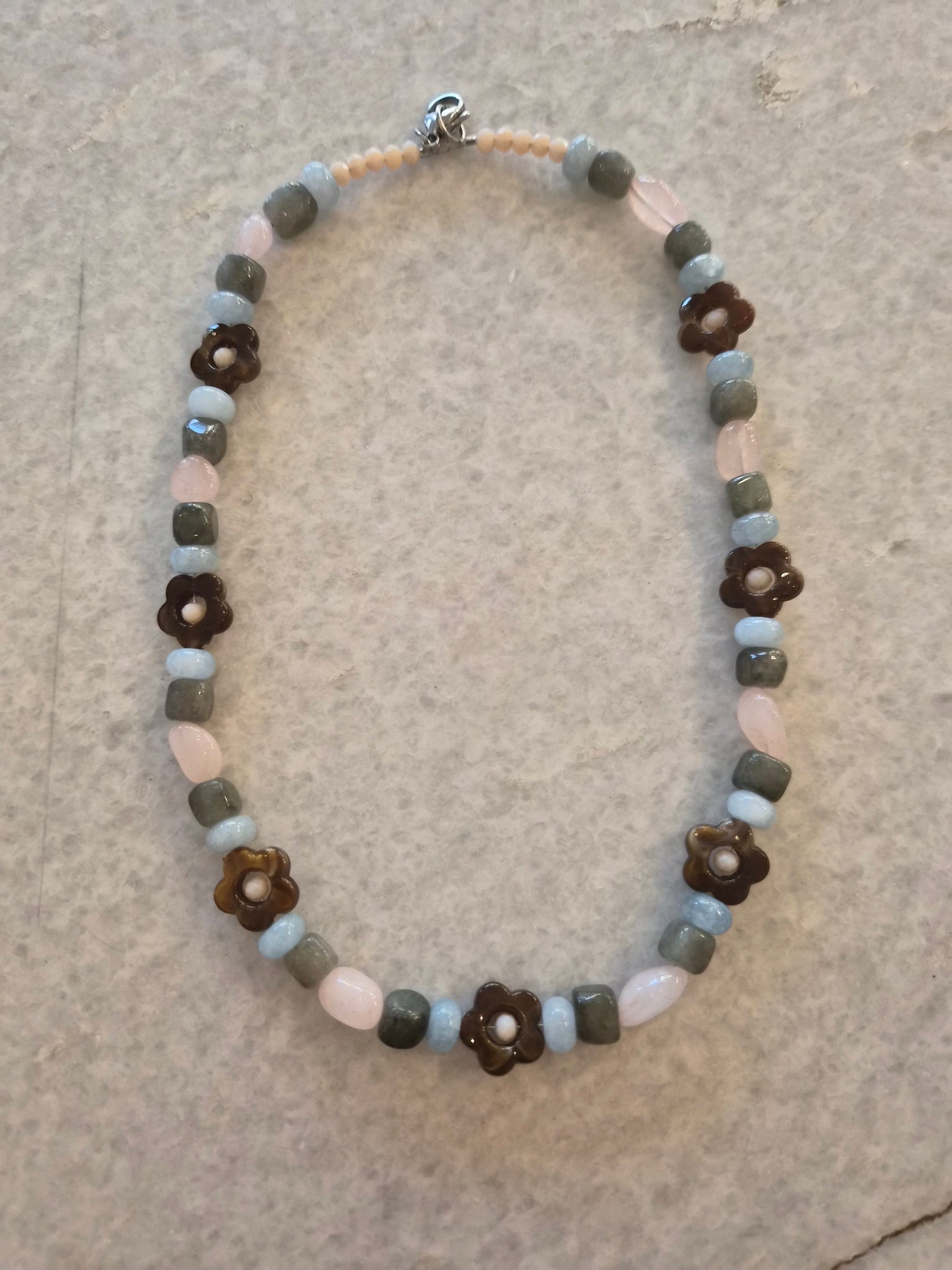 Stones: acrylic flowers, green morganite, pink quartz, abacus beads, and glass accents.