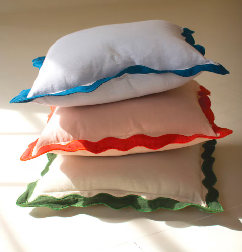 Mix and match this set of three cotton pillows with a ruffled edge.