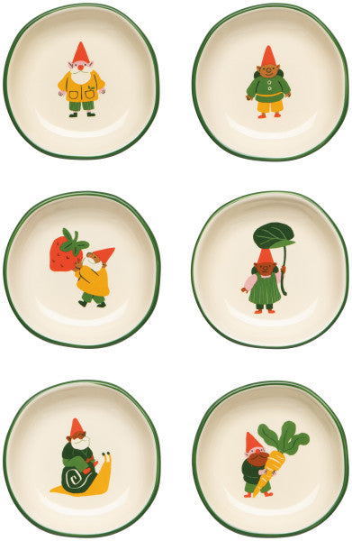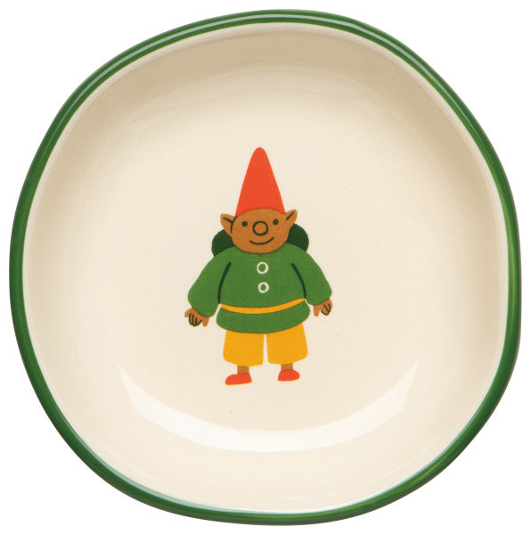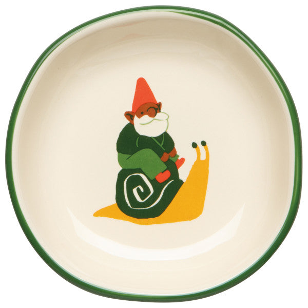 Ideal for holding salt, spices, dipping sauces, olives, jewelry, or small desk treasures, these bowls bring a dose of whimsy wherever they land. With a soft cream interior and green rim, they mix beautifully while each gnome keeps their own personality.