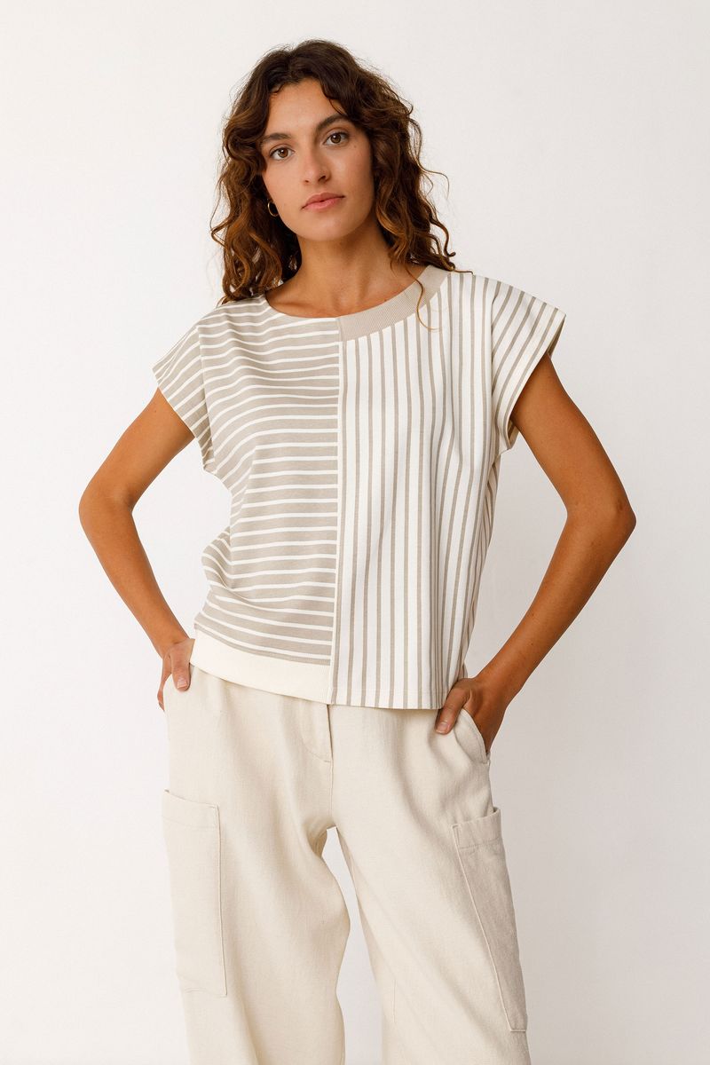 Playful yet polished, the Ekai T-Shirt uses contrast and direction to redefine the standard striped top. Featuring a color-blocked construction that meets at a central seam, it juxtaposes horizontal and vertical stripes for a bold, graphic look. Crafted from 100% organic cotton, this tee offers a structured yet soft feel that is as comfortable as it is conscious.