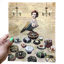 High quality print of a fifties-style harpy surrounded by a cacophony of handmade foods.