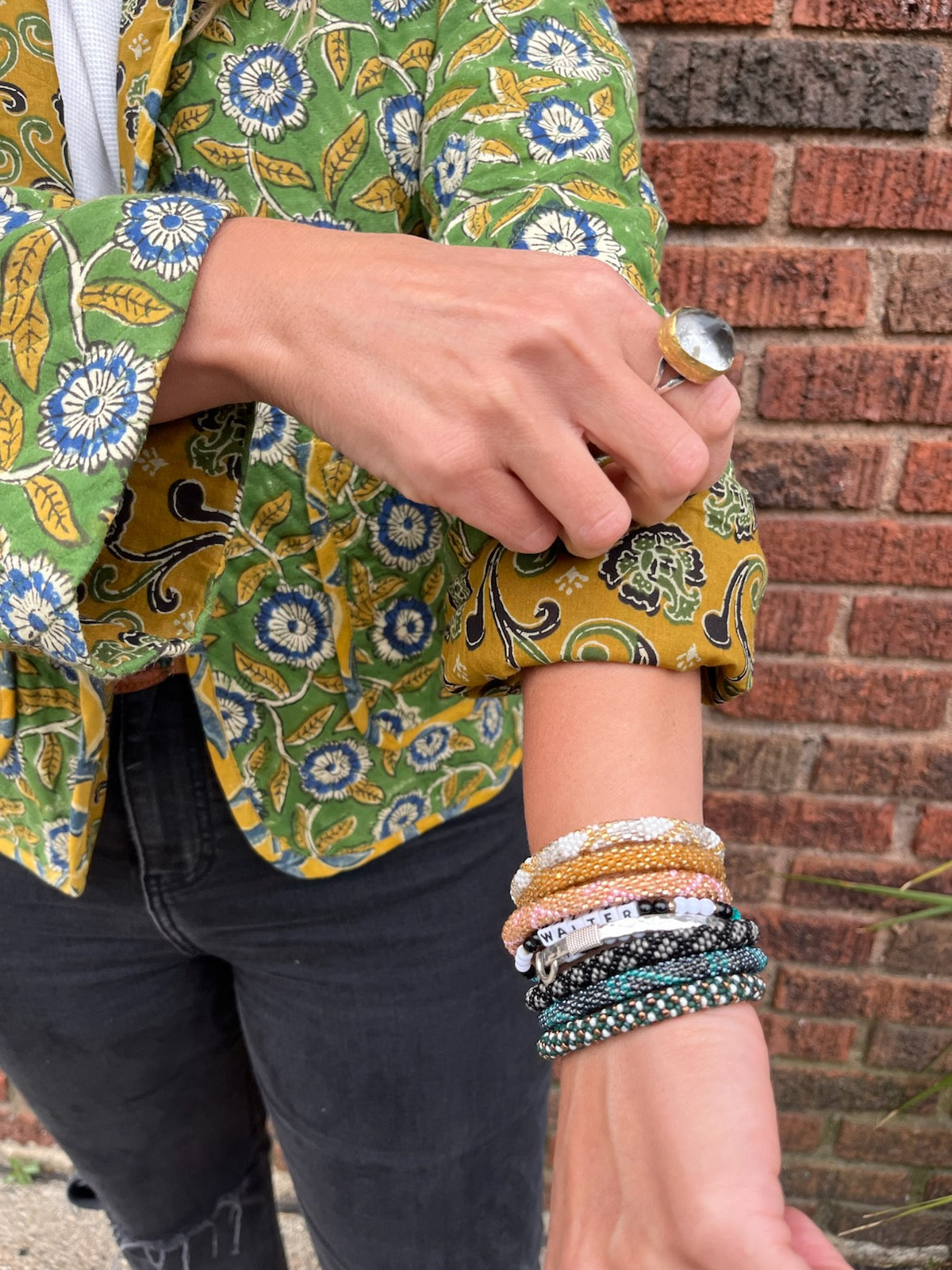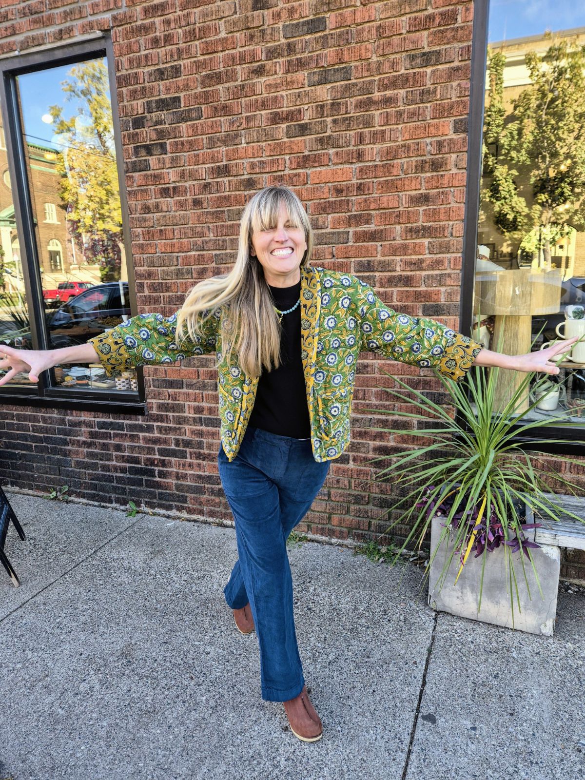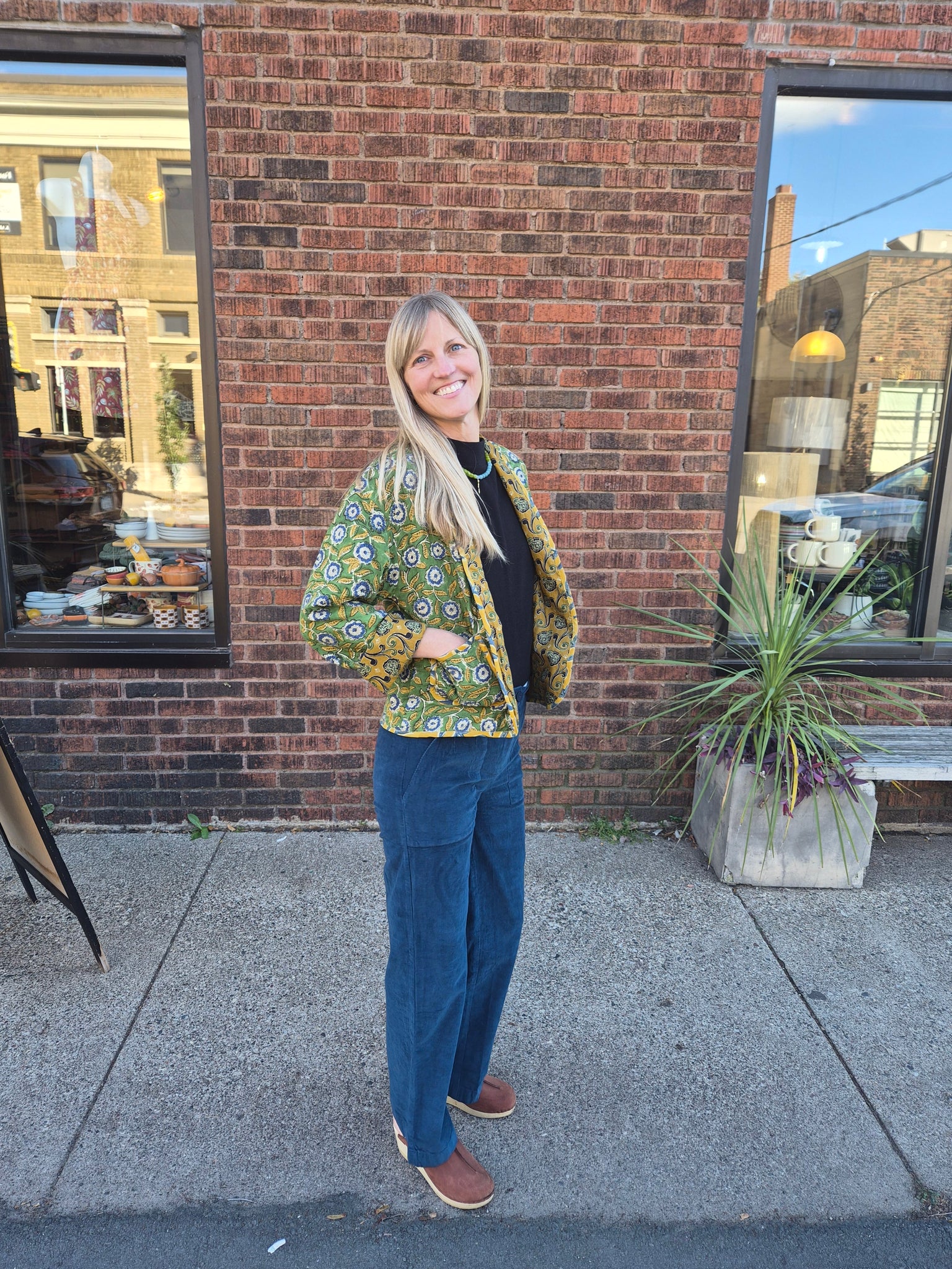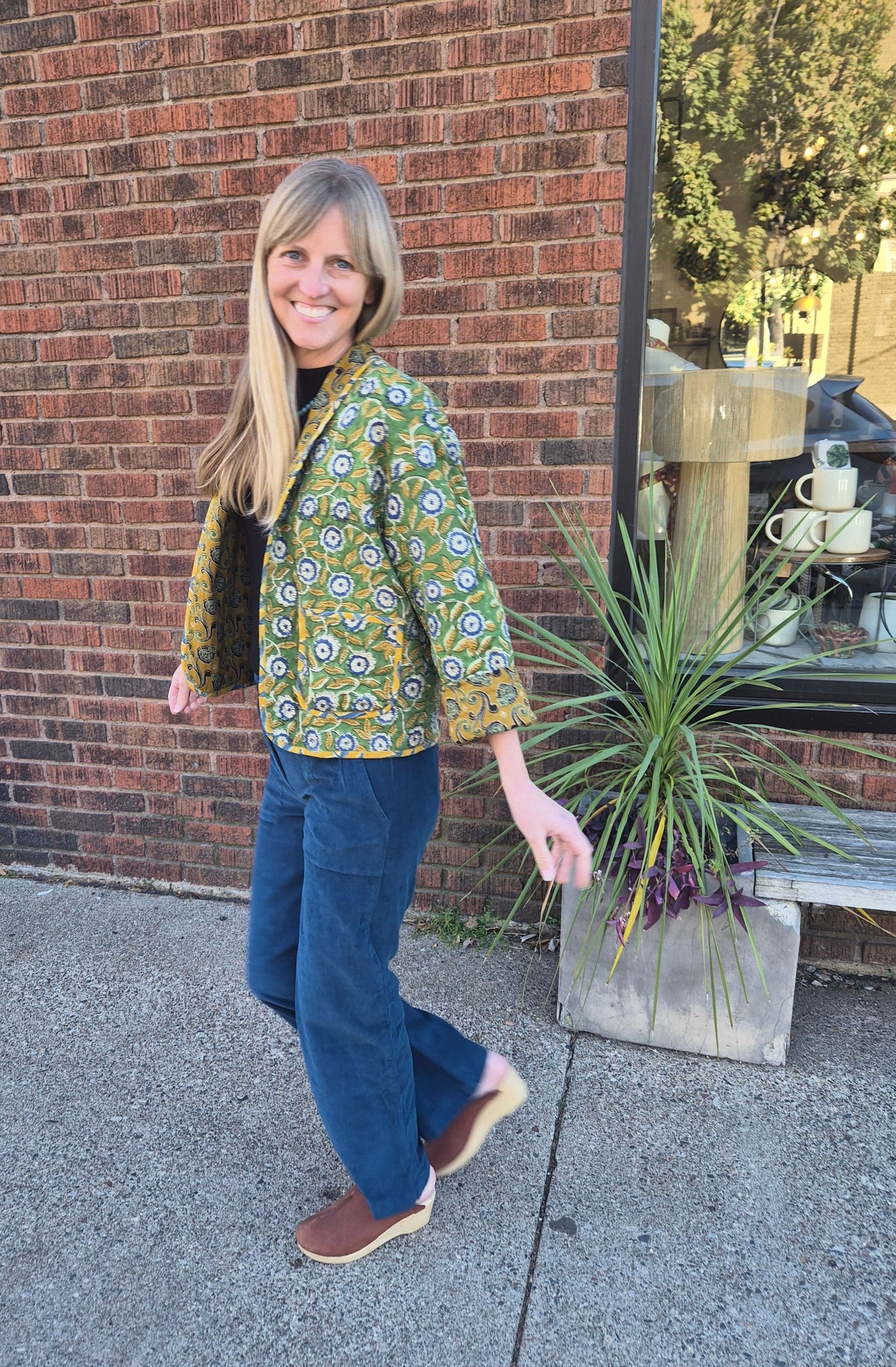 Sing with the colors of the forest in our Woodland Song Quilted Jacket. A rich green background sets the stage for mustard-brown leaves and delicate blue blossoms, creating a design that feels both earthy and vibrant.