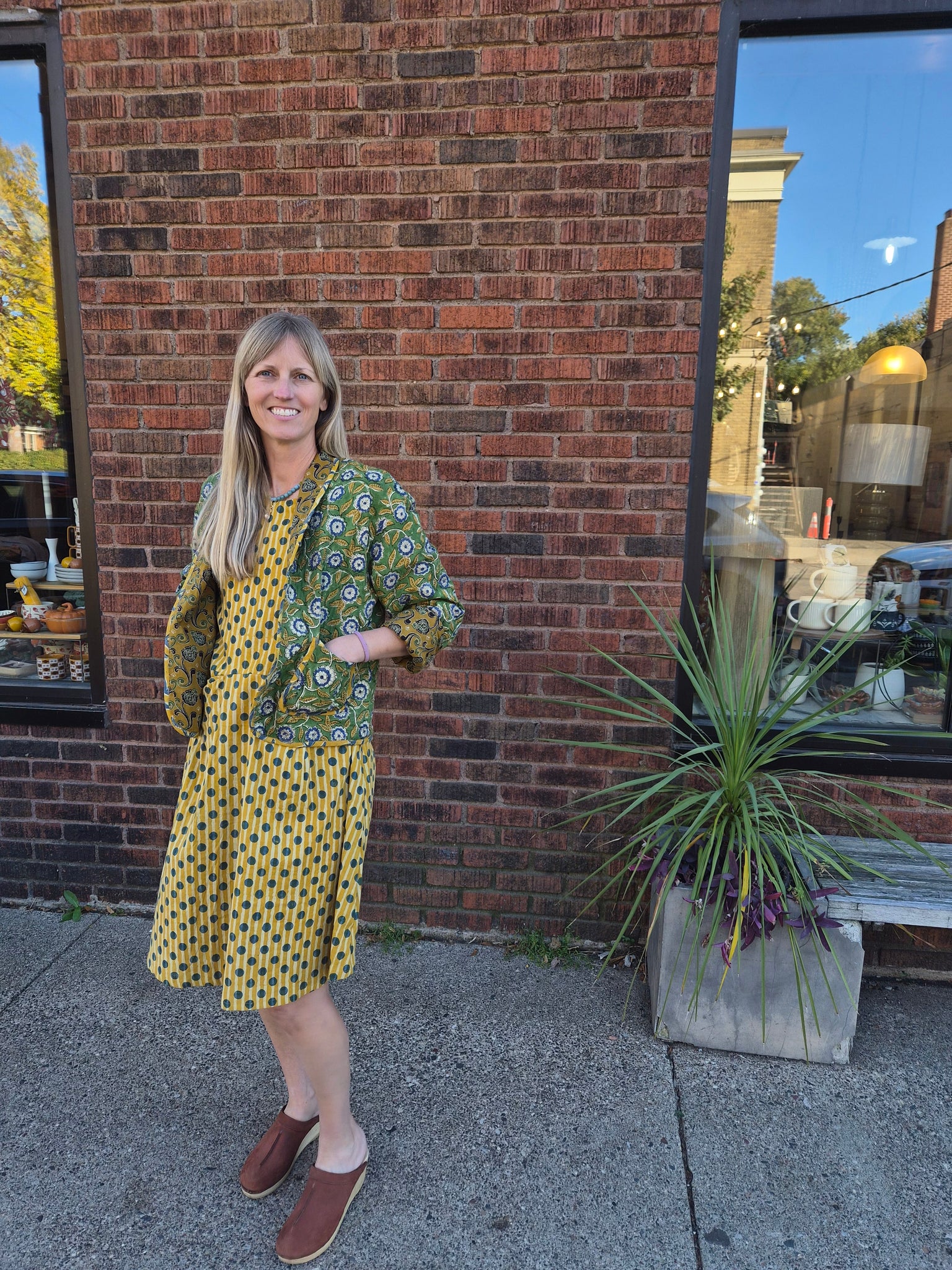 Thoughtful details include two practical pockets, contrast piping, and fold-over sleeves that reveal a coordinating lining for a charming finish.