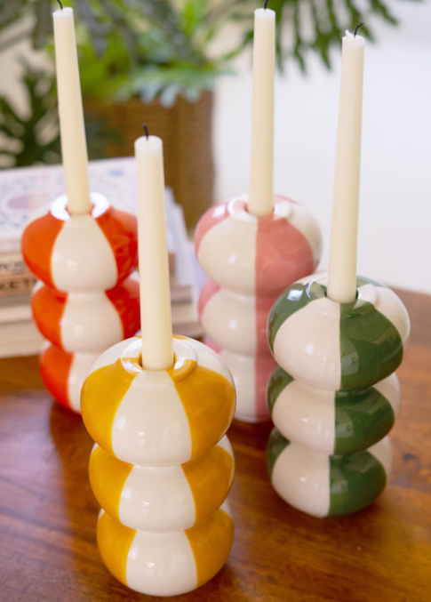 Playful, bold, and beautifully handcrafted — these ceramic taper candle holders bring instant cheer to any table or shelf. Each one features a modern bubble silhouette with hand-painted stripes in warm, happy hues. Mix and match the colors for an artful, eclectic glow at dinner or display them solo for a sculptural pop of color.