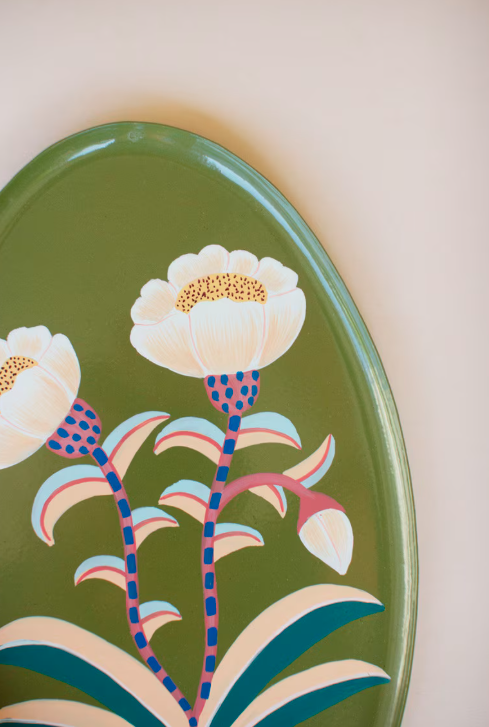 Catch clutter or dish up décor with these botanical trays. Hand painted designs. Made in India. Metal.