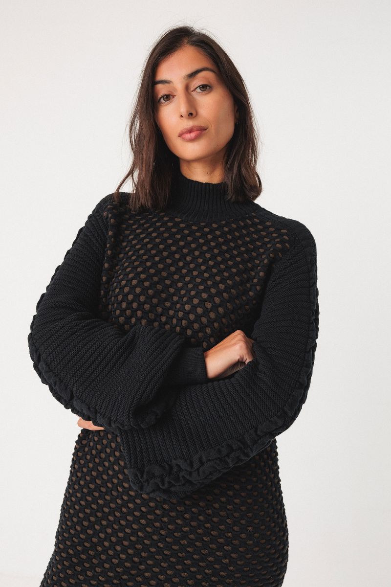 Textured bicolour tricot dress. Straight fit. Above-the-knee length. High ribbed collar. Ribbed long balloon sleeves. Mid weight.